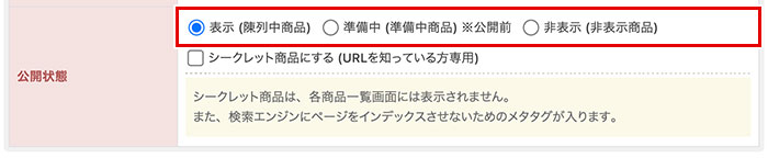 「商品管理」→「商品一覧」からの商品の登録・変更画面にて、【公開状態】欄から商品の公開状態を選択してください。