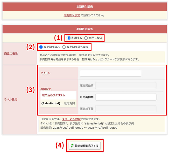 ※商品に販売期間を表示したい場合などに設定してください。 - 『設定処理を完了する』をクリックします。