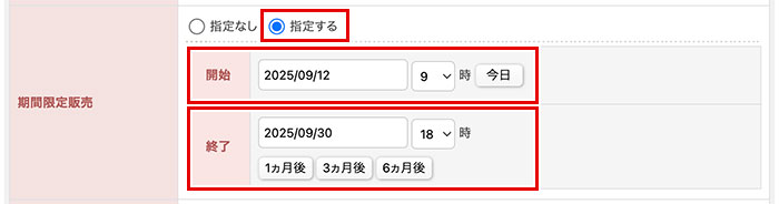 販売期間のみ:指定した期間のみショップに商品を表示して販売します。