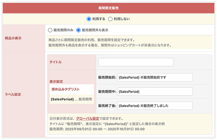 - 埋め込みタグ {SalesPeriod} を利用していただくと、販売期間が表示できます。