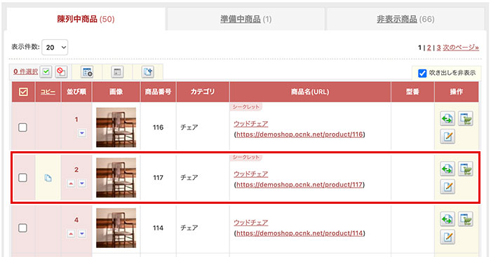]等のアイコンをクリックし、ステータスの変更や商品のコピーができます。