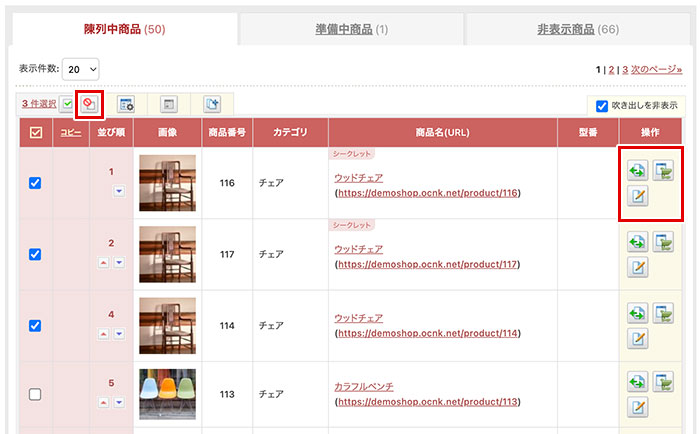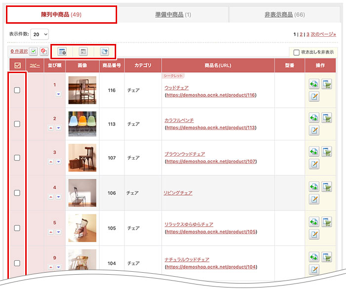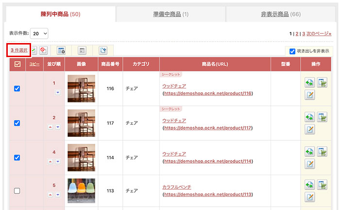 商品一覧の複数選択とステータス変更/コピー/削除について